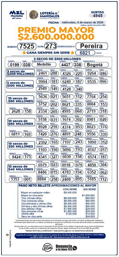 El sorteo número 4945 de la Lotería de Manizales se llevó a cabo el miércoles cuatro de marzo dejando los siguientes resultados: