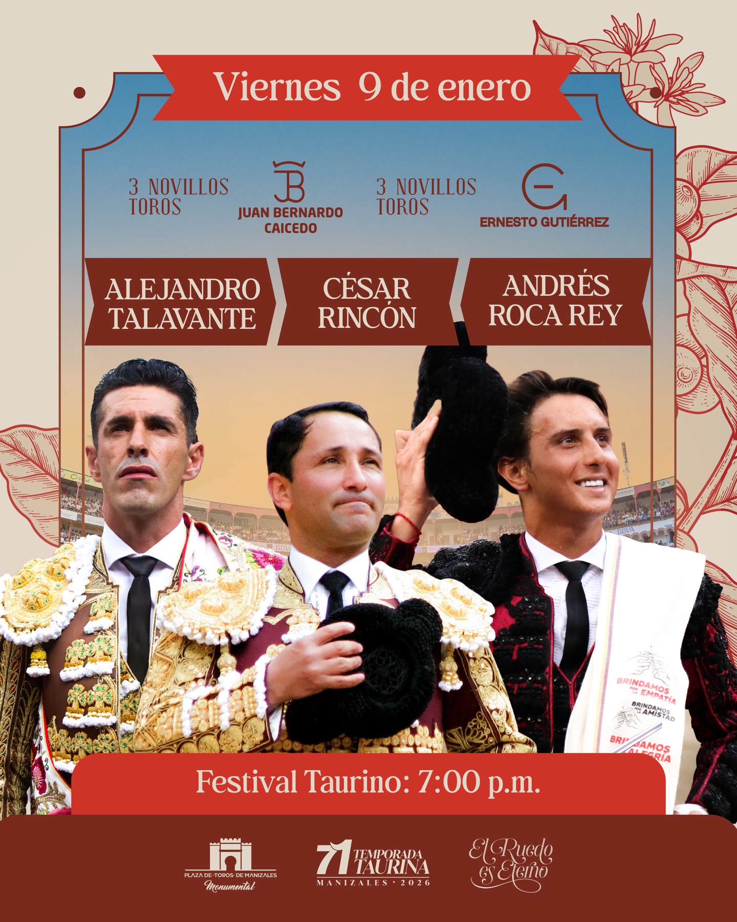 La feria, que podría convertirse en uno de los últimos ciclos taurinos en la capital caldense, reúne a un amplio grupo de figuras internacionales y colombianas: David de Miranda, Manuel Libardo, José Arcila, David Galván, Sebastián Castella, Juan Hernández, Luis Bolívar, Antonio Ferrera, Olga Casado, Felipe Miguel Negrete, Juan de Castilla, Román, Alejandro Talavante, Daniel Luque y Marcos Pérez.