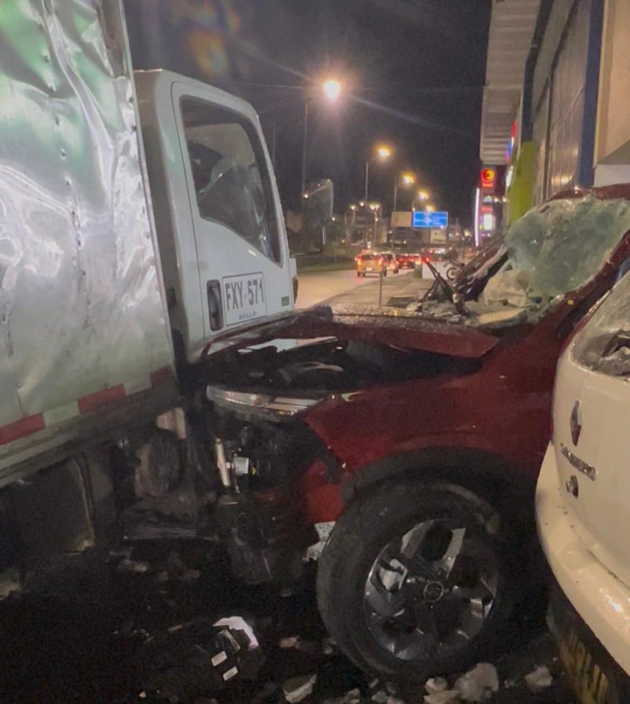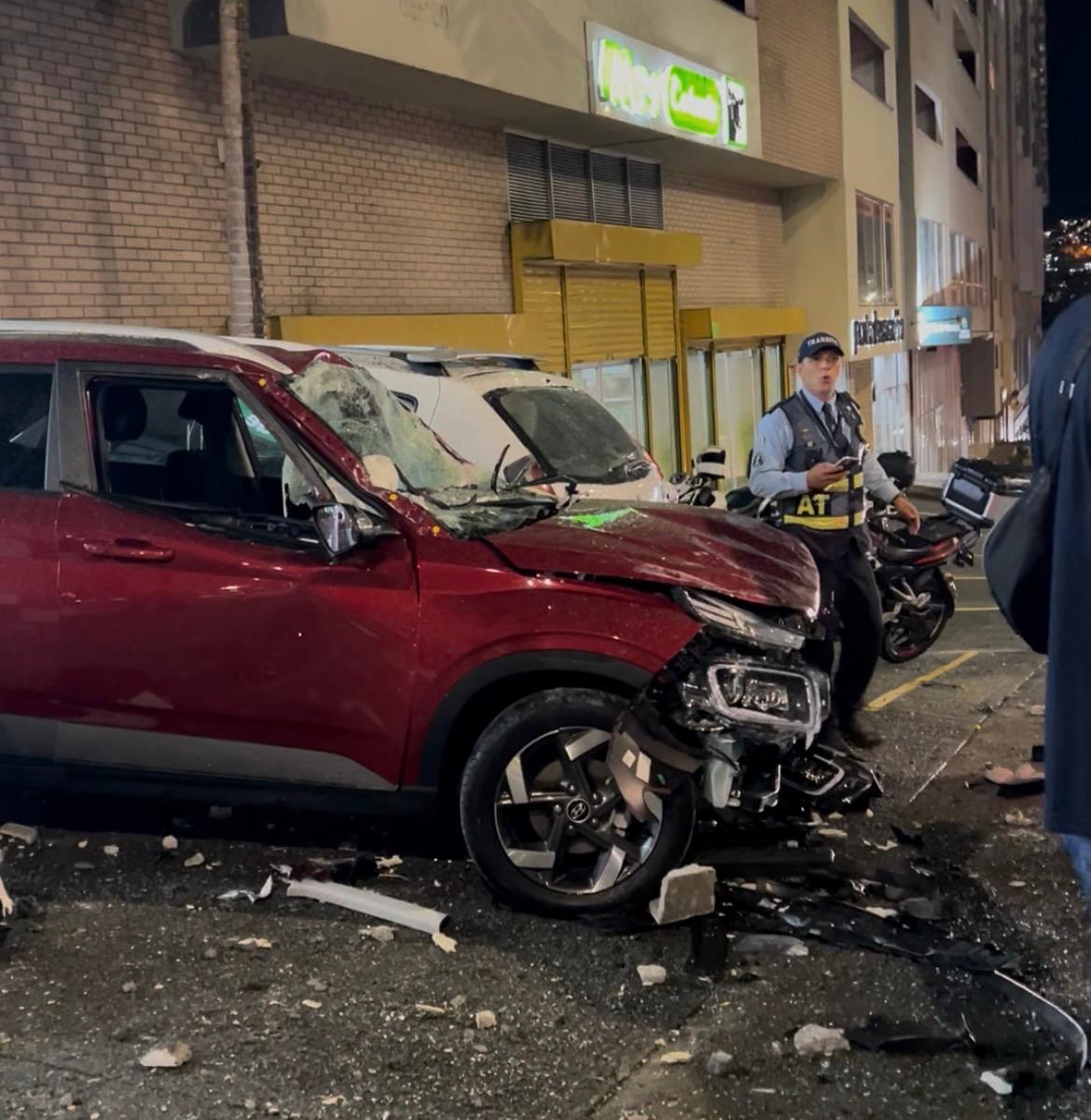 El automóvil, un Hyundai Venue con placas de Manizales, terminó impactando contra un camión tipo furgón, que se encontraba estacionado en el lugar y fue clave para detener la caída, evitando que el vehículo golpeara directamente contra el suelo.